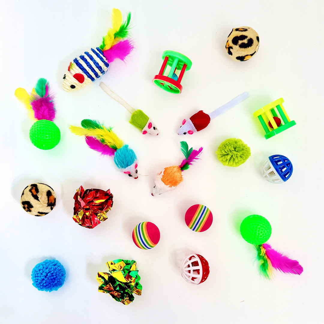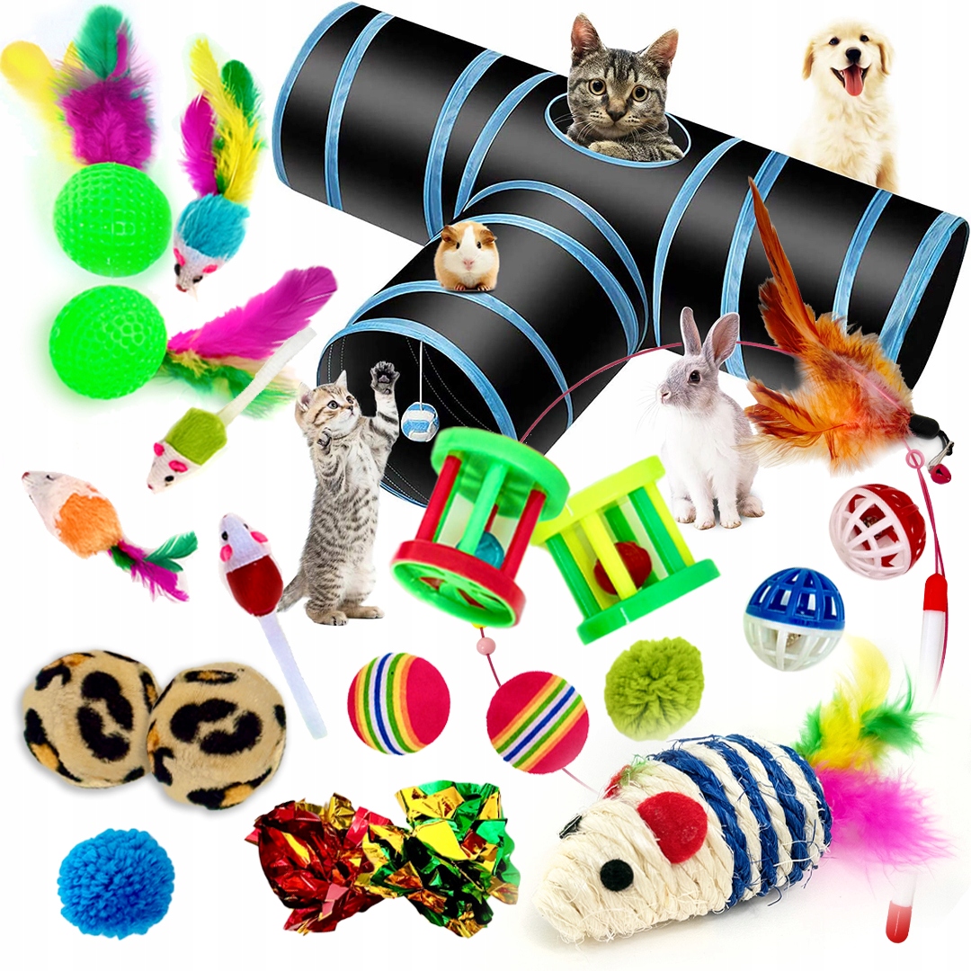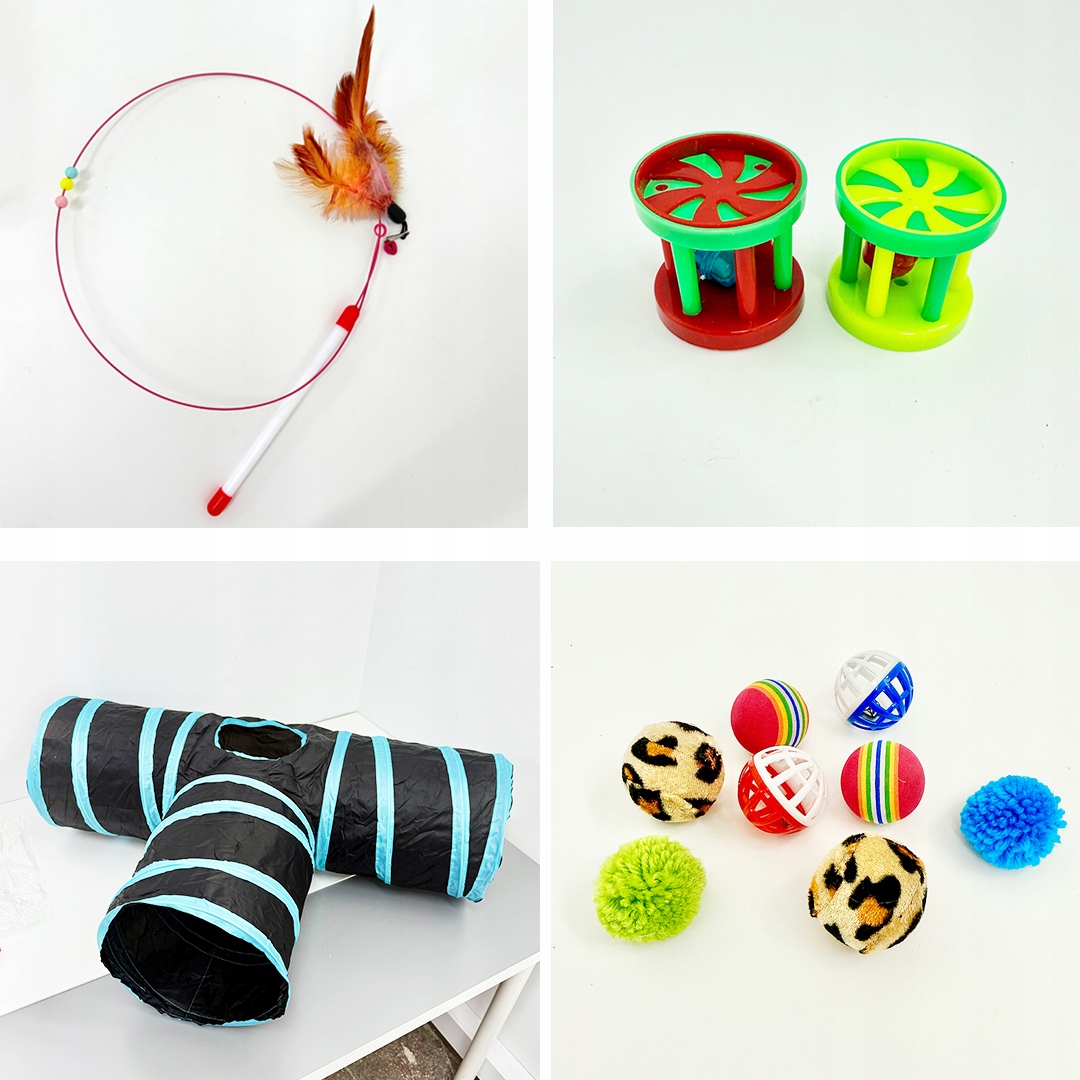 Ten ogromny zestaw 21 elementów zapewni Twojemu pupilowi godziny aktywnej zabawy i ruchu. Kolorowe piłeczki, myszki, pompony, wędka z piórkami i przede wszystkim duży tunel w kształcie litery T sprawią, że Twój kot będzie szczęśliwy, wybiegany i zadowolony.