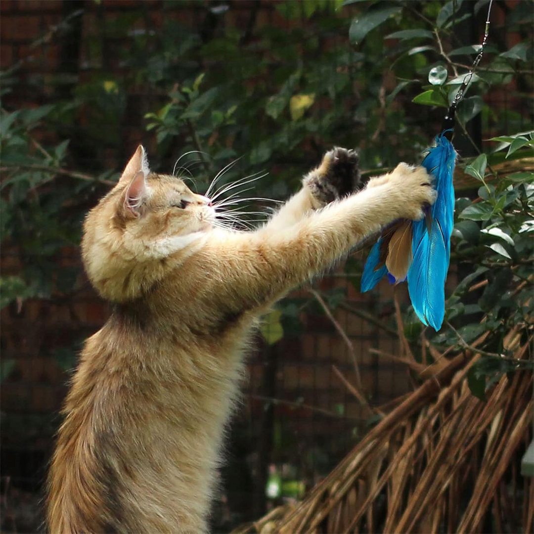 Do zestawu dołączona jest interaktywna wędka z doczepianą zawieszką z piórkami i dzwoneczkami. To świetny sposób na wspólną zabawę i budowanie więzi z pupilem.