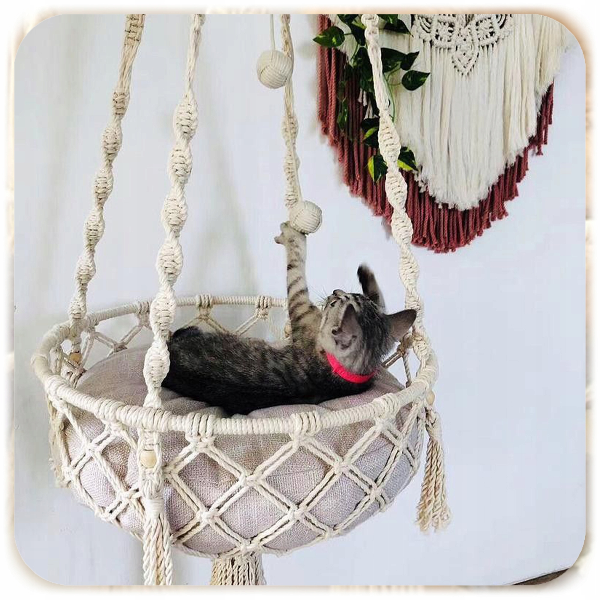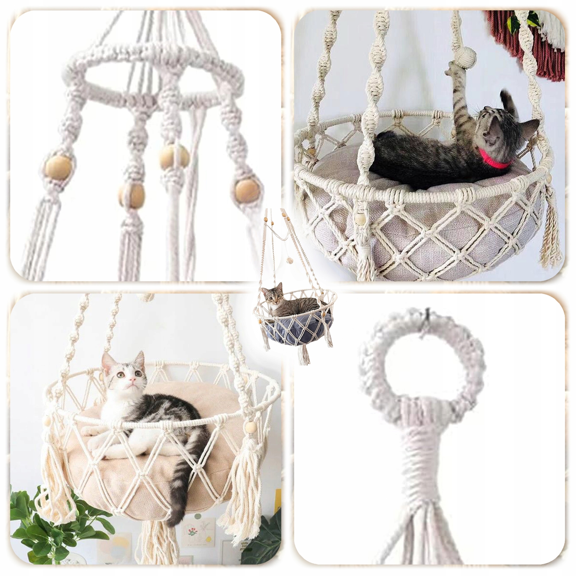 Hamak wykonano ręcznie z plecionego, wytrzymałego sznurka bawełnianego. Drewniane koraliki i długie frędzle podkreślają styl boho i sprawiają, że legowisko świetnie komponuje się z nowoczesnymi, skandynawskimi i naturalnymi aranżacjami wnętrz.