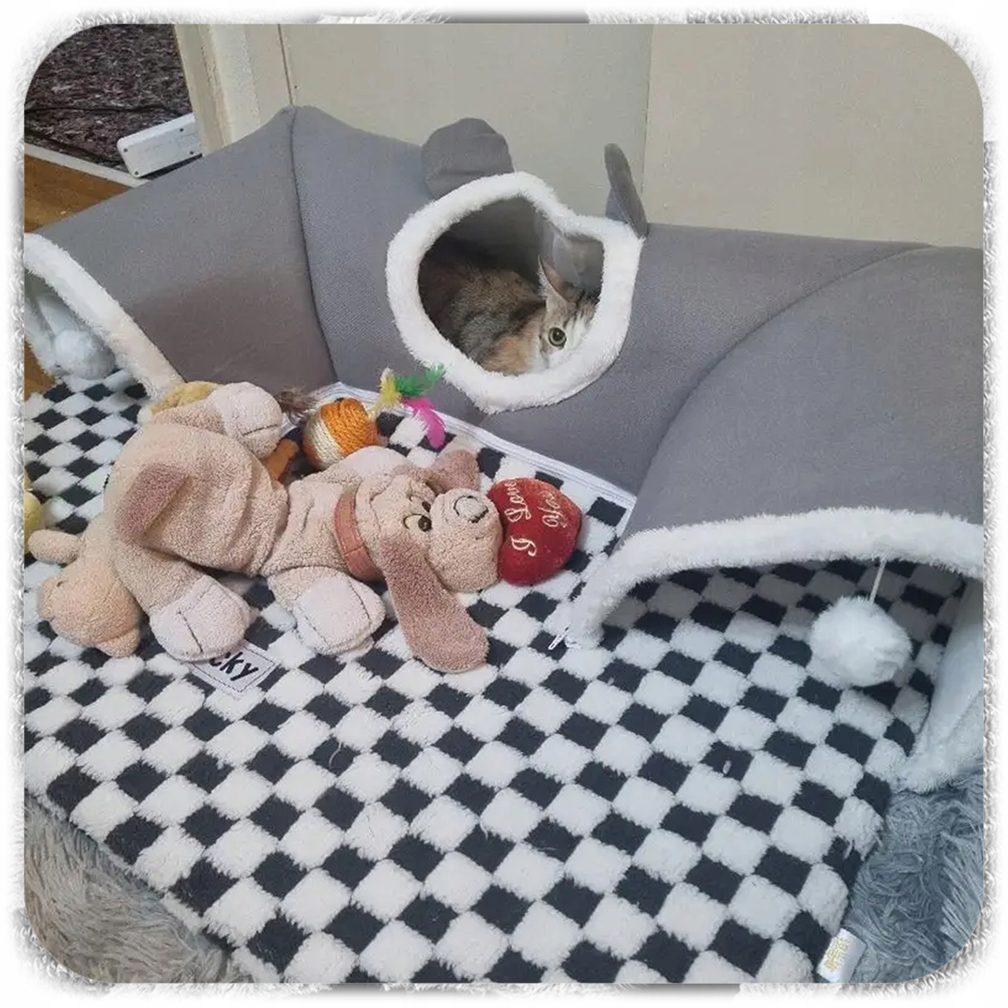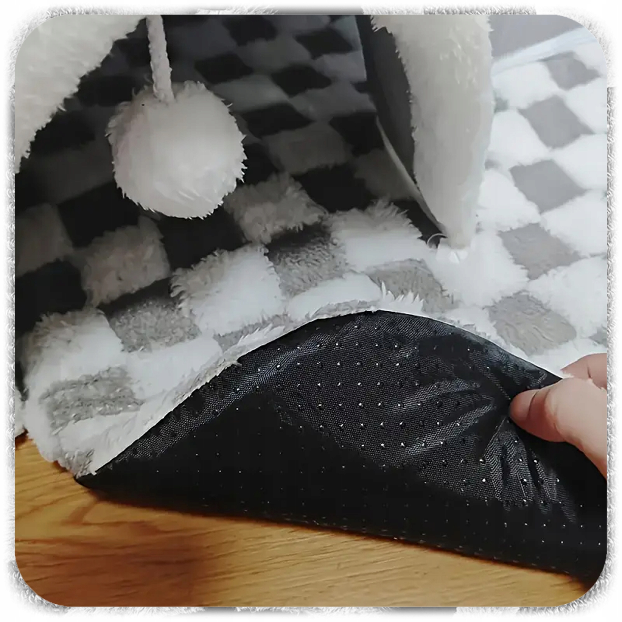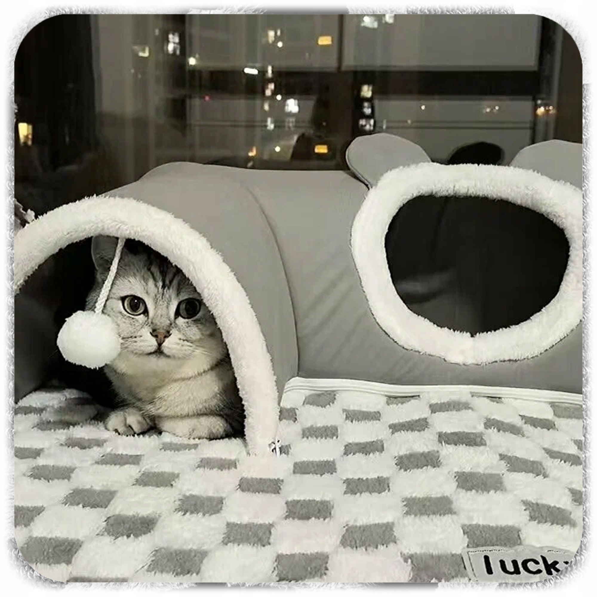 To duże legowisko z tunelem łączy komfort snu z aktywną rozrywką. Miękka, pluszowa mata w szachownicę i tunel z wiszącymi pomponami sprawią, że Twój zwierzak będzie mógł jednocześnie drzemać, chować się i bawić.