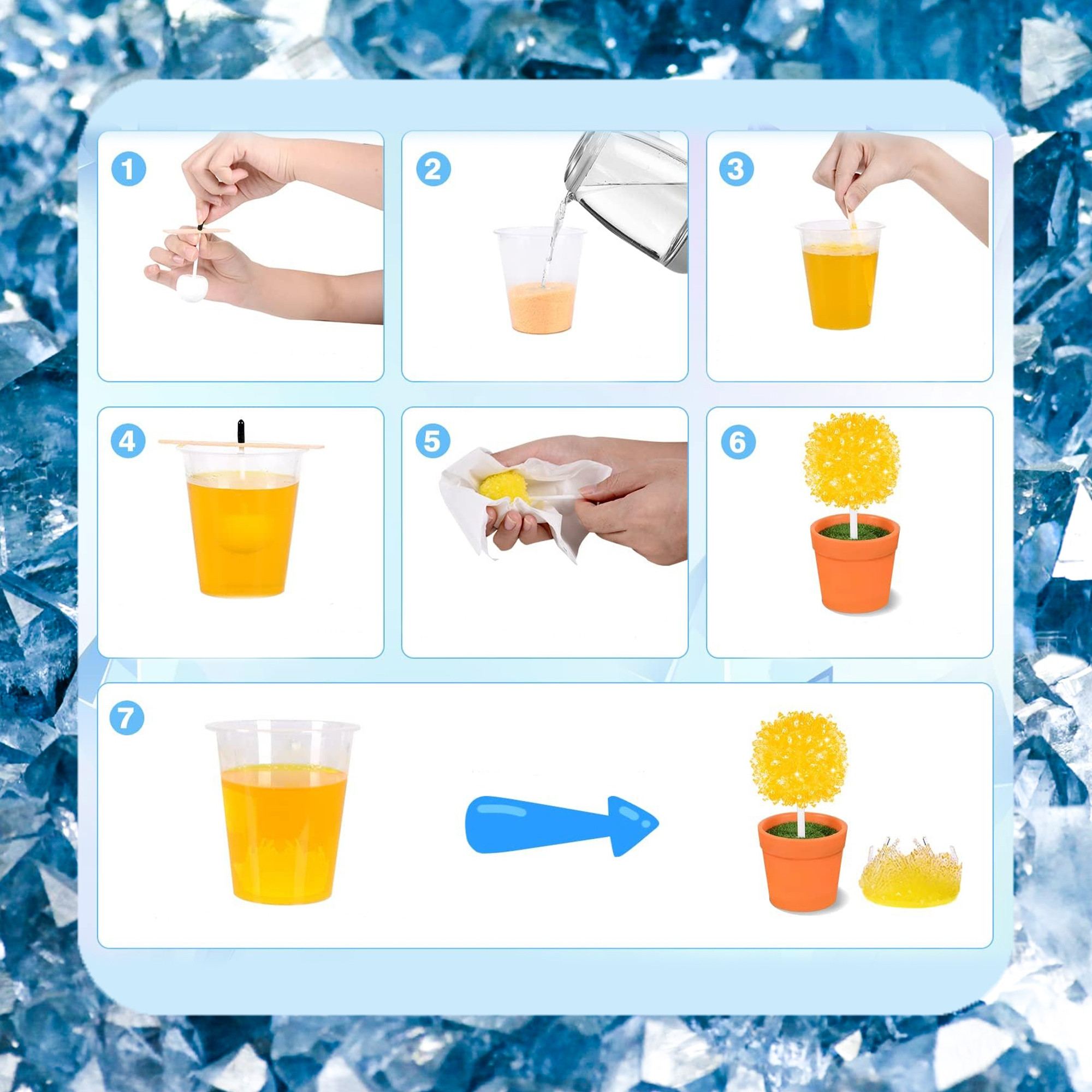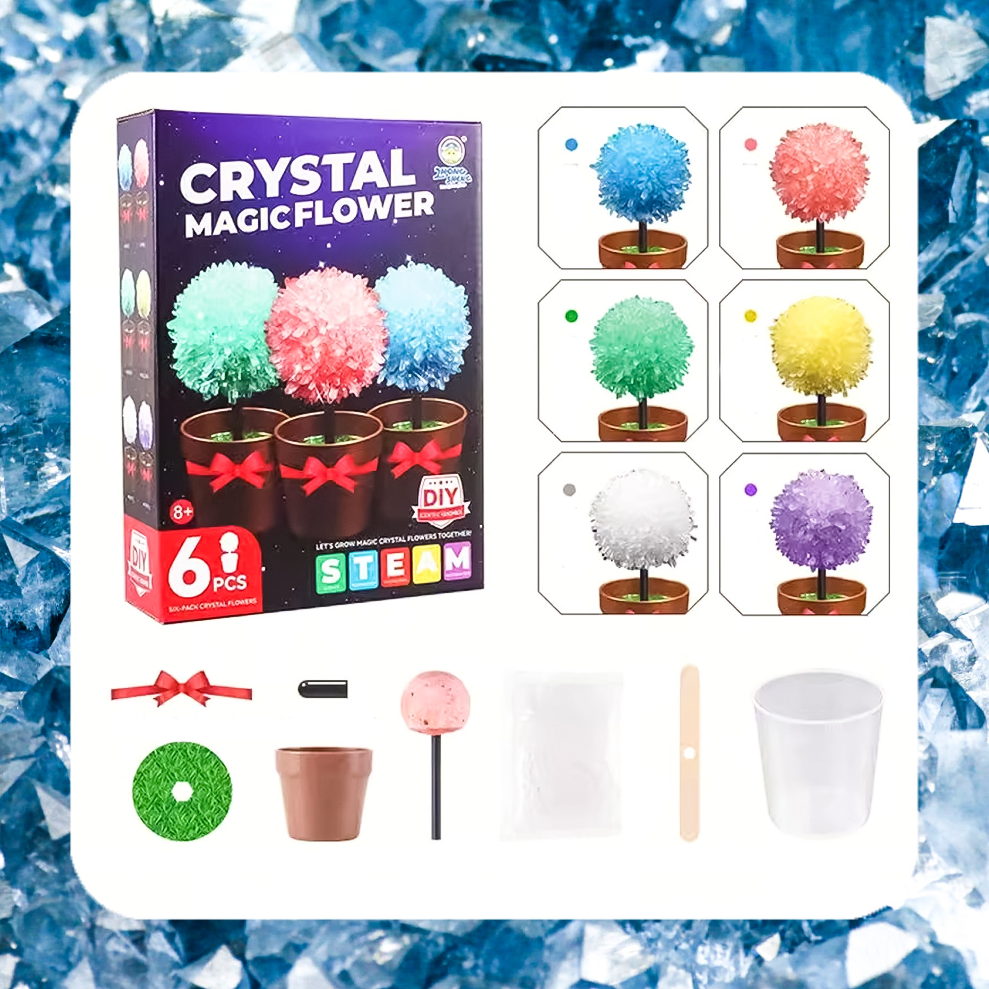 Zestaw edukacyjny do hodowli kryształów dla dzieci od 8 lat. Pozwala na stworzenie 6 kolorowych, kryształowych drzewek, ucząc cierpliwości i obserwacji.