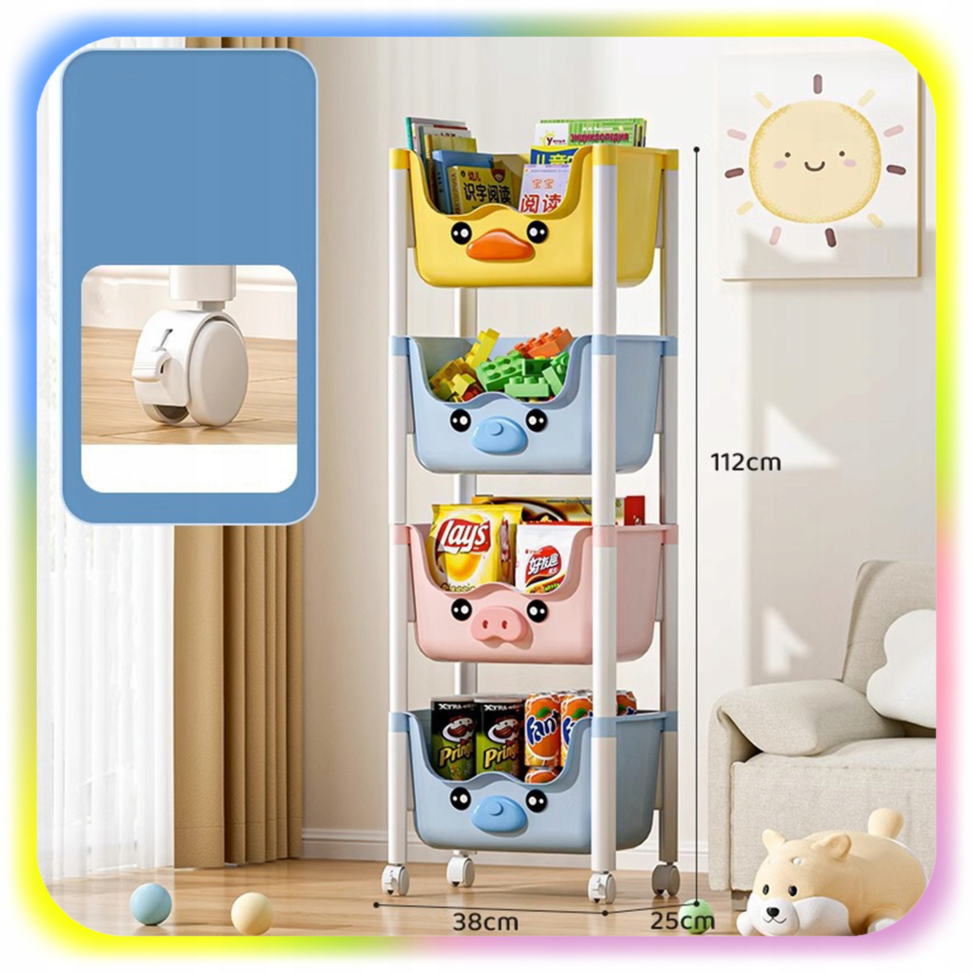 〰️ Czteropoziomowy regał na kółkach z kolorowymi koszyczkami to idealny sposób na połączenie zabawy z organizacją przestrzeni. Doskonały dla dzieci, ale równie przydatny w innych pomieszczeniach.