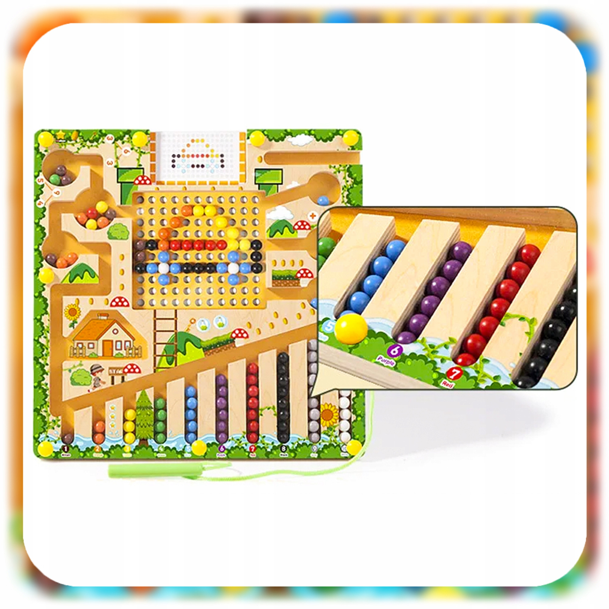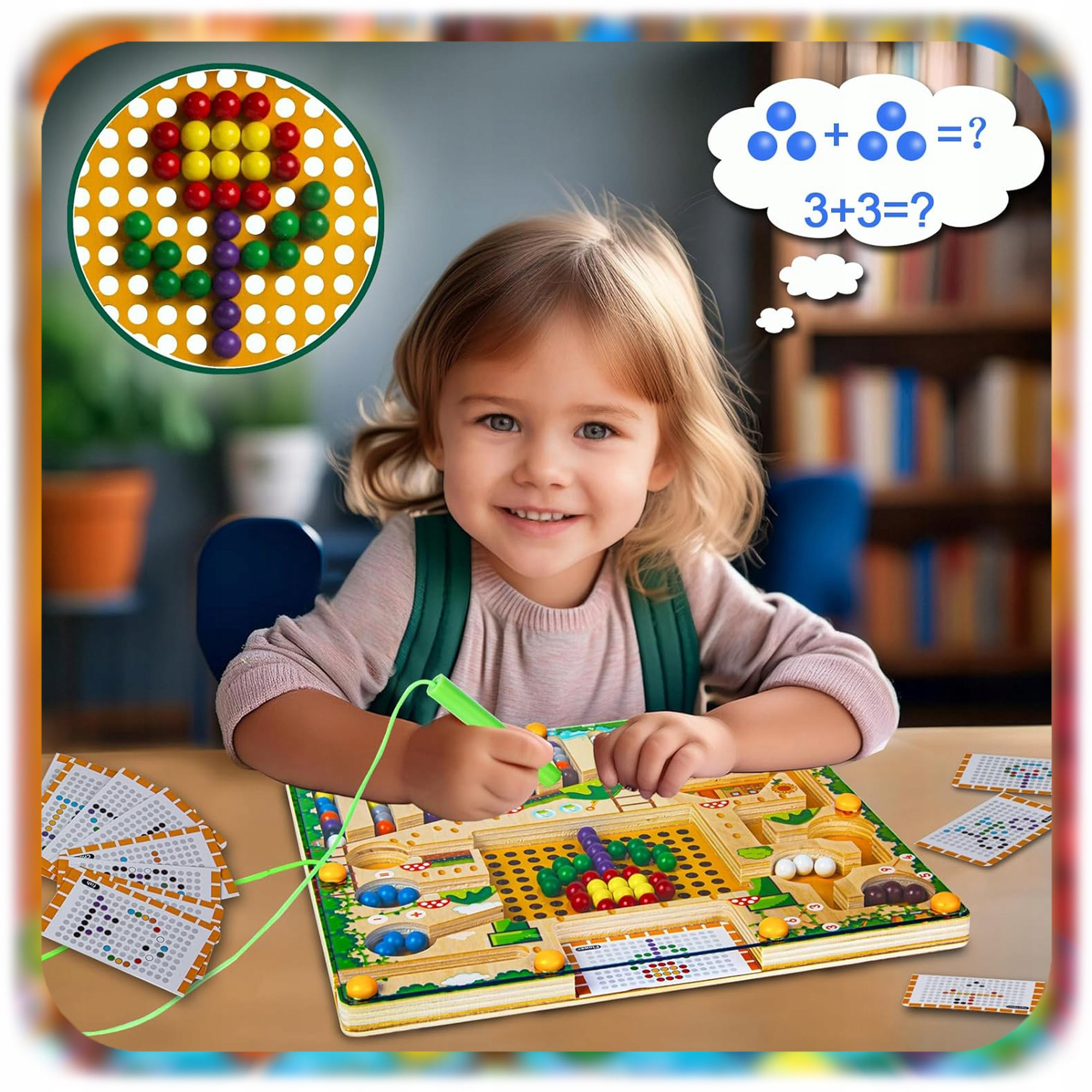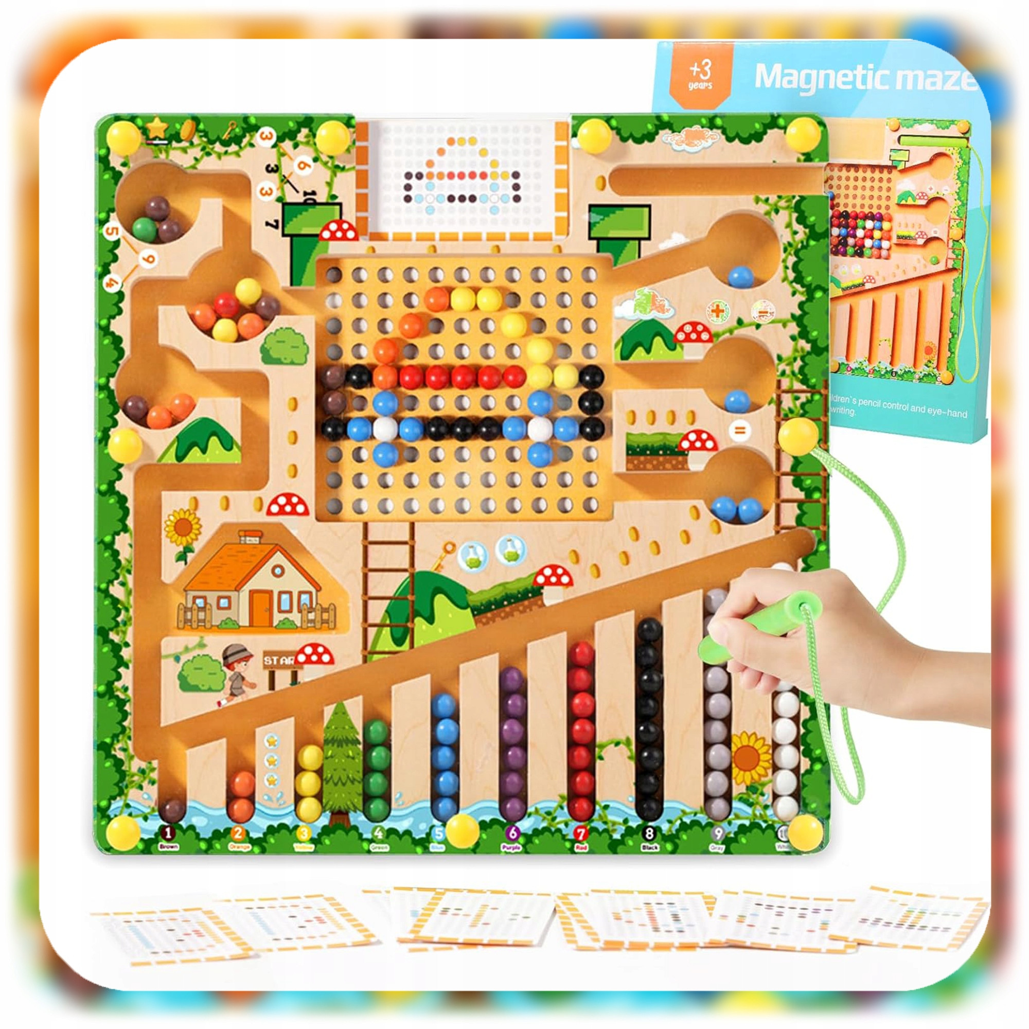 ✅ W zestawie znajduje się: 55 kolorowych kulek, magnetyczny pisak oraz plansza z ilustracjami i zadaniami.