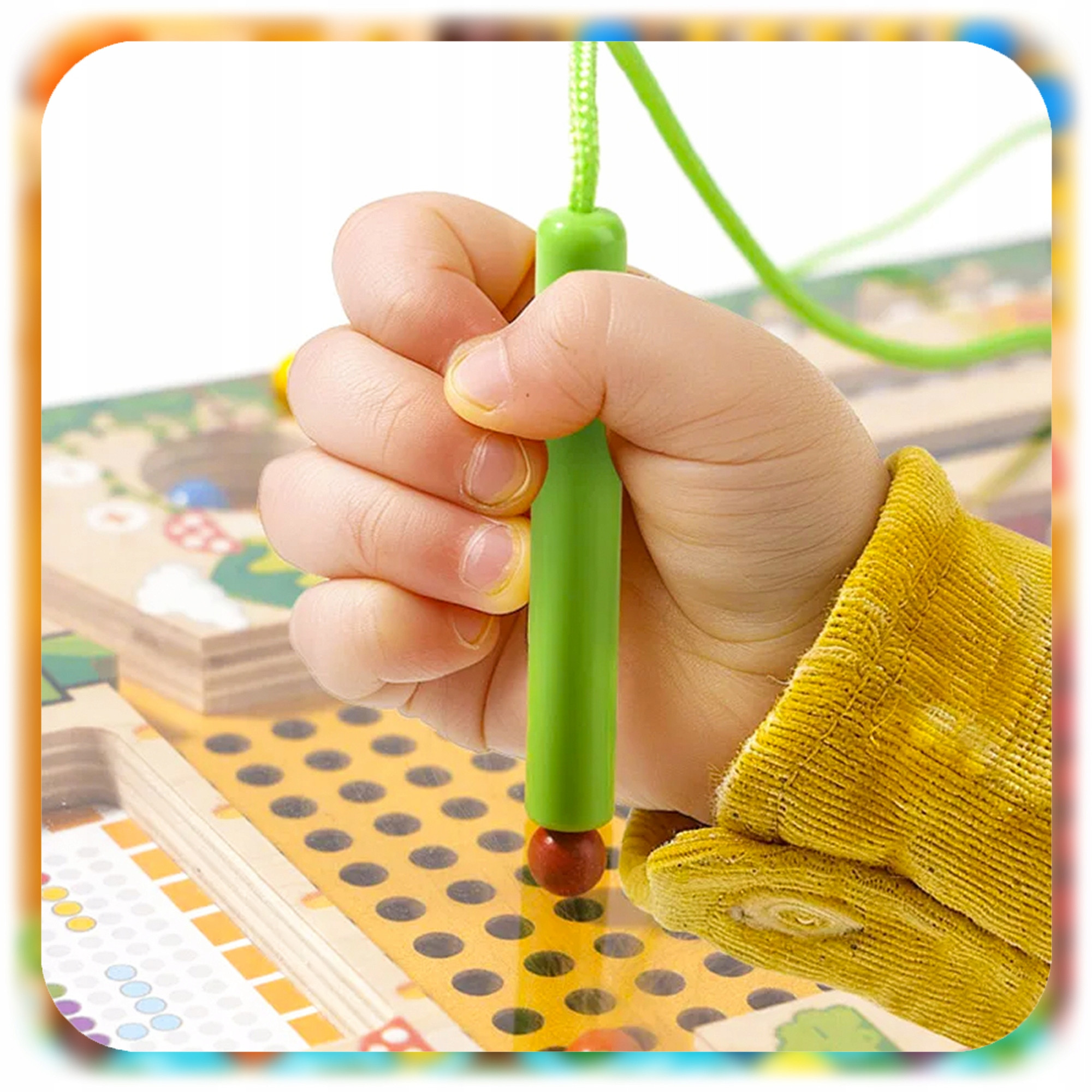Dzięki dołączonemu magnetycznemu rysikowi dziecko może przesuwać kulki przez labirynt – to bezpieczna i atrakcyjna forma nauki chwytu pisarskiego, rozwijająca koordynację ręka-oko i motorykę małą.
