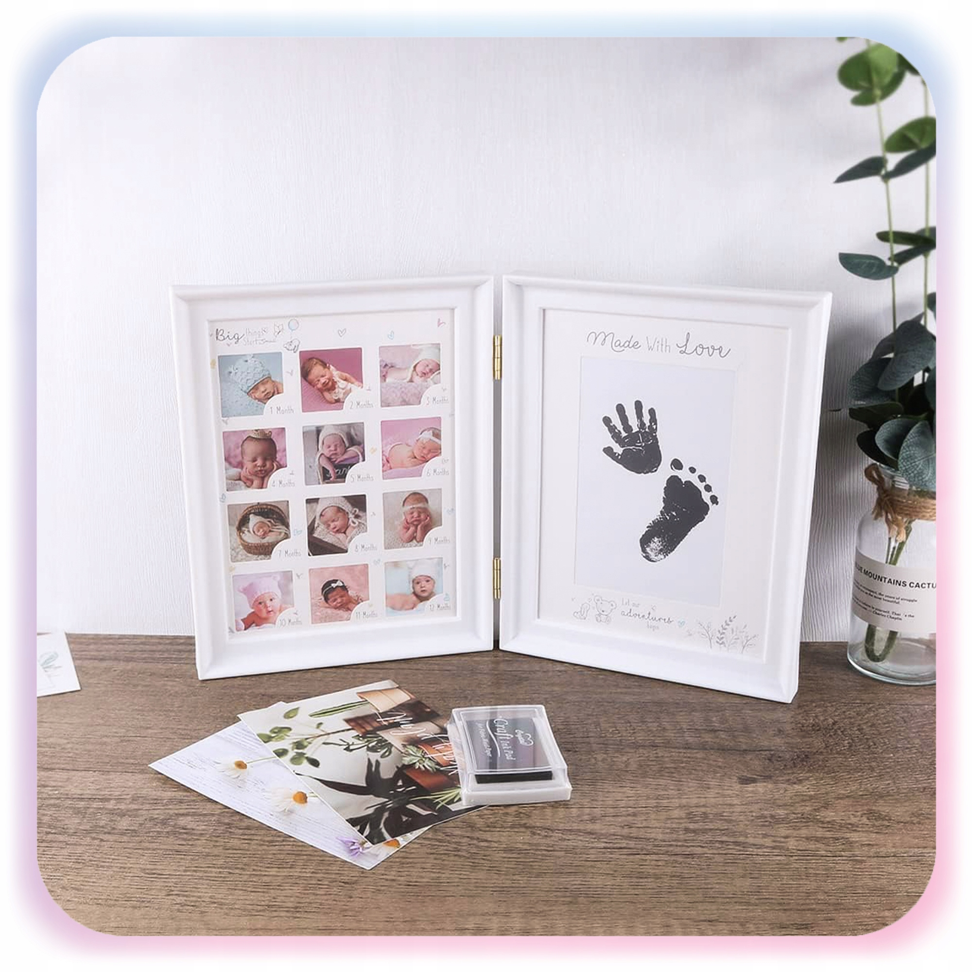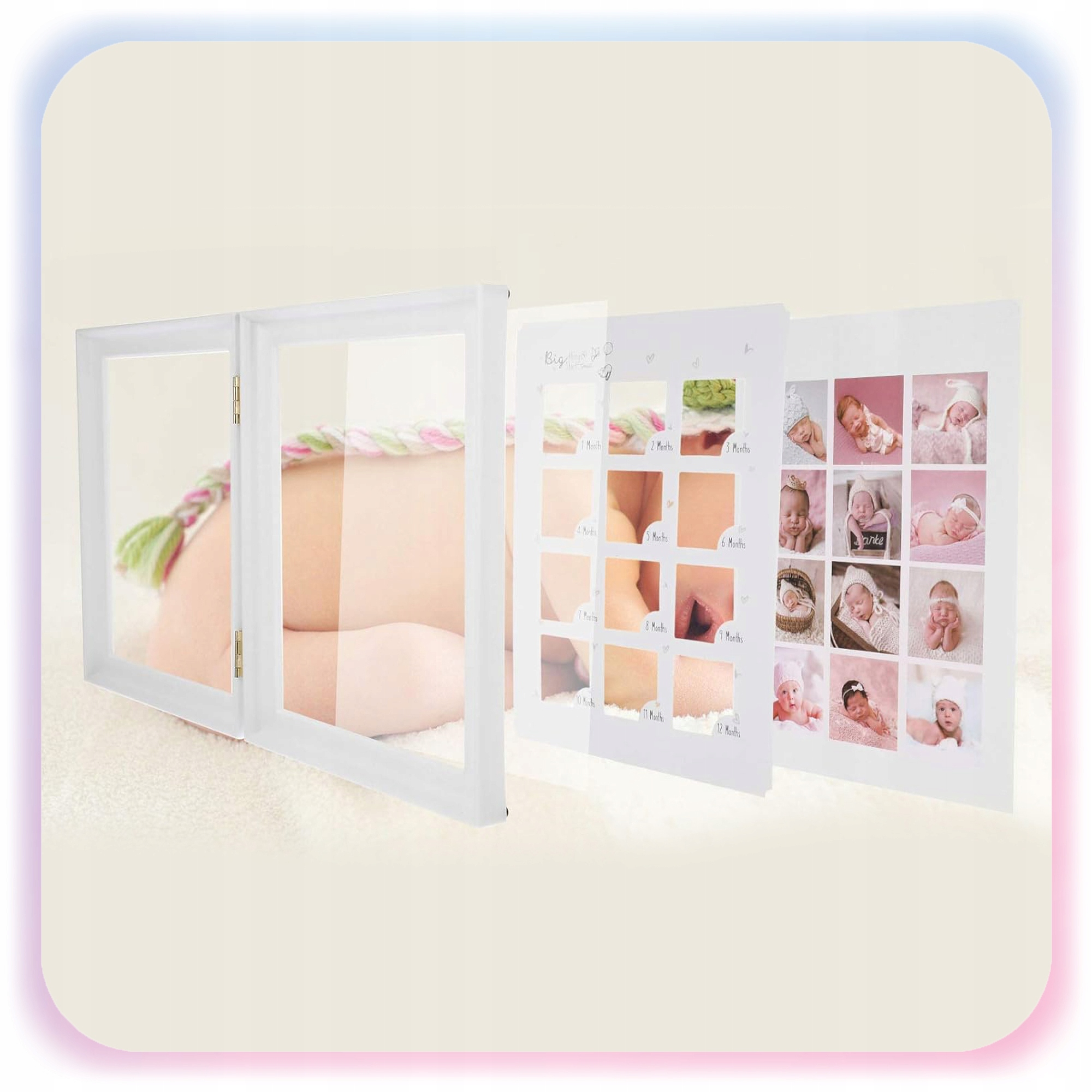 ✅ Ramka pomieści 12 zdjęć w formacie mini – po jednym z każdego miesiąca życia dziecka – oraz 1 większy odcisk dłoni lub stópki. To wyjątkowy sposób na pokazanie, jak szybko rośnie Twój maluszek.
