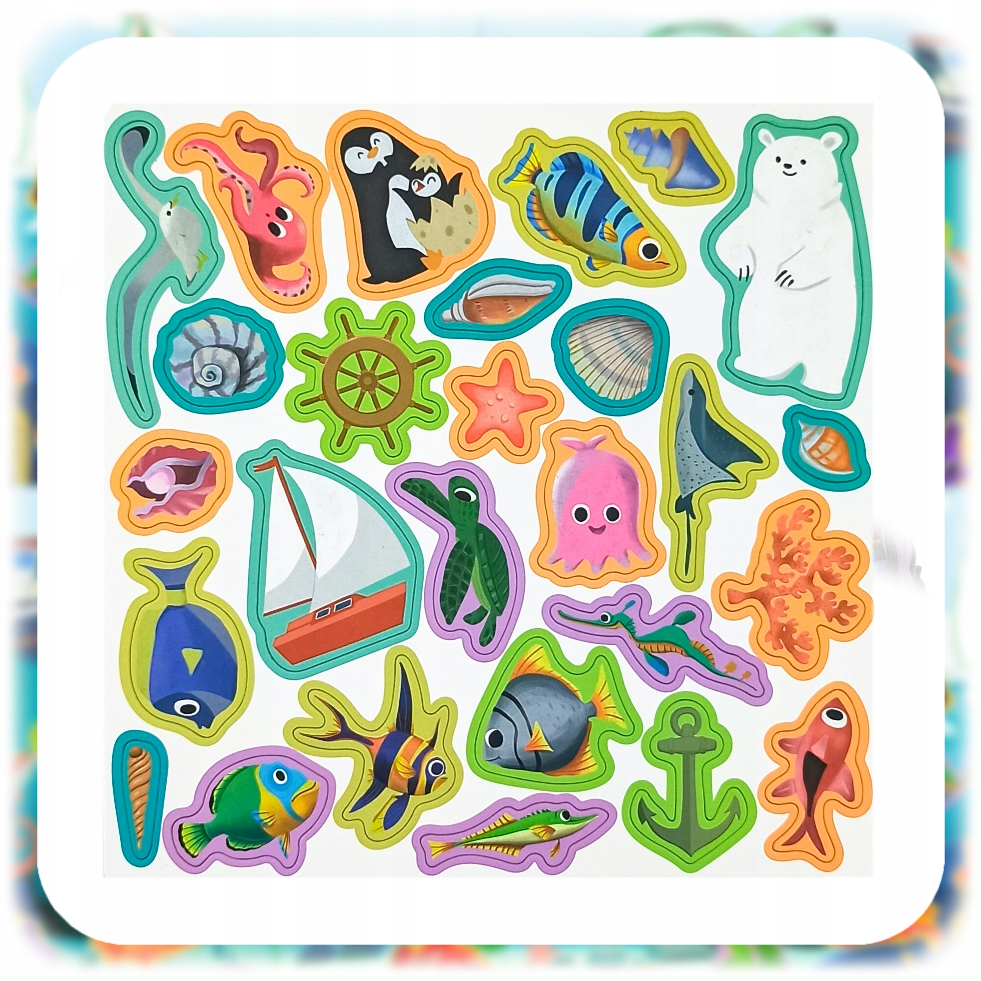 W zestawie znajduje się aż 50 kolorowych magnesów, przedstawiających: