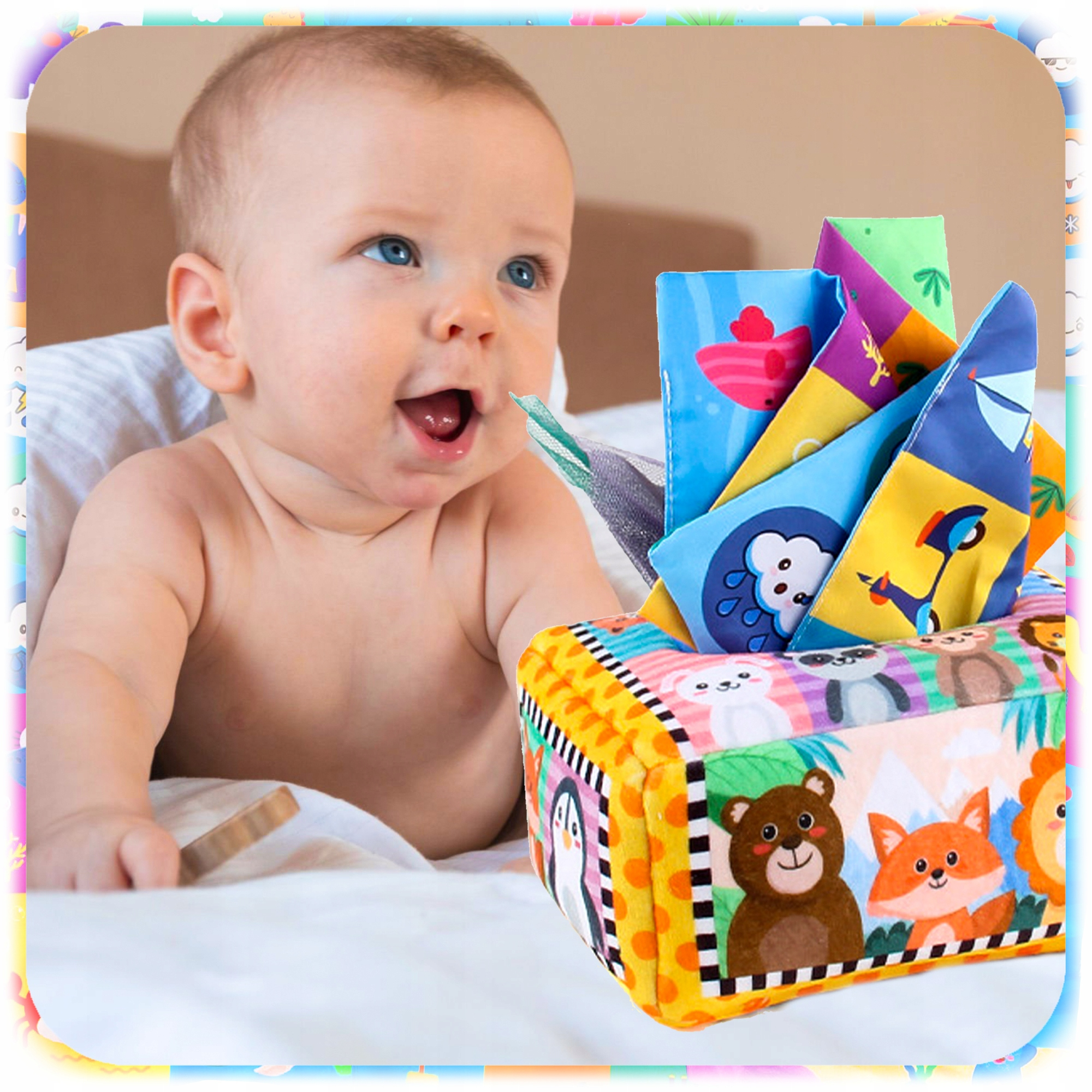✔️ Wielofunkcyjna edukacja – każda grubsza chusteczka posiada różne wzory po obu stronach, takie jak zwierzątka morskie, dinozaury, pojazdy, chmurki pogodowe. Chusteczi szeleszczą, a jedna posiada dodatkowo piszczałkę.