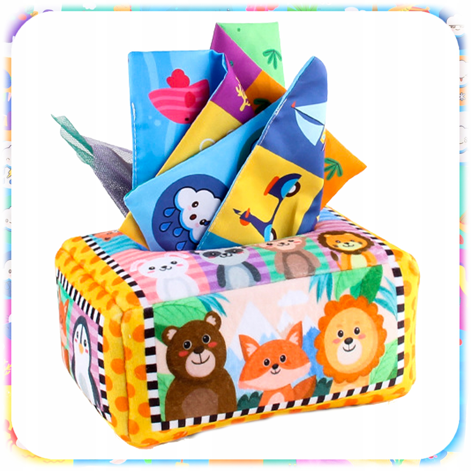 Zabawka, która zachwyci każde dziecko i rodzica! Pluszowe pudełko z kolorowymi chusteczkami to połączenie radości zabawy z rozwojem sensorycznym. Inspirowane metodą Montessori, ćwiczy zręczność, wspiera naukę kolorów, kształtów, zjawisk pogodowych, środków transportów, zwierząt, a także zapewnia mnóstwo frajdy podczas wkładania i wyciągania materiałów.