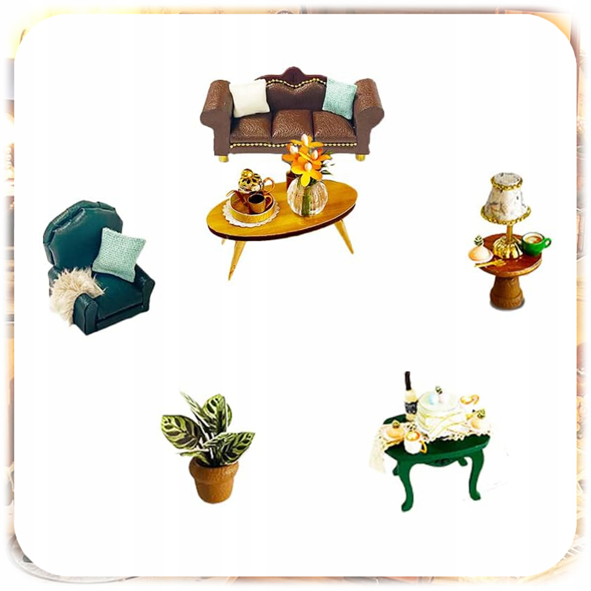 Model przedstawia piętrowy pawilon z dwoma oddzielnymi pomieszczeniami i tarasem, wyposażony w komplet mebli, akcesoriów i dekoracji – wszystko w skali mini, ale maksymalnie realistyczne.
