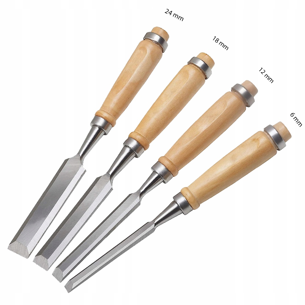 ✅ Zestaw zawiera 4 sztuki dłut o szerokościach: 6 mm, 12 mm, 18 mm i 24 mm – idealne do różnych zastosowań, od precyzyjnych detali po głębsze nacięcia.