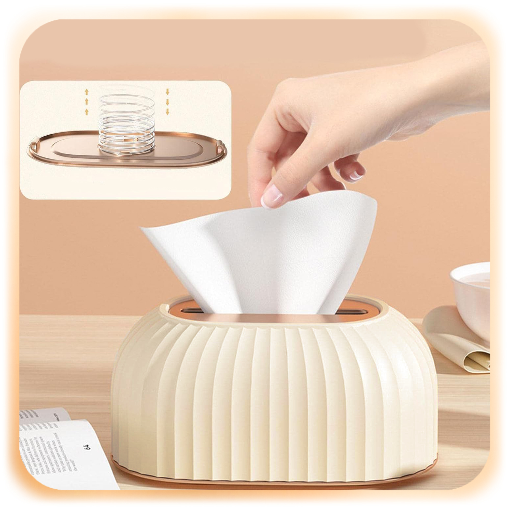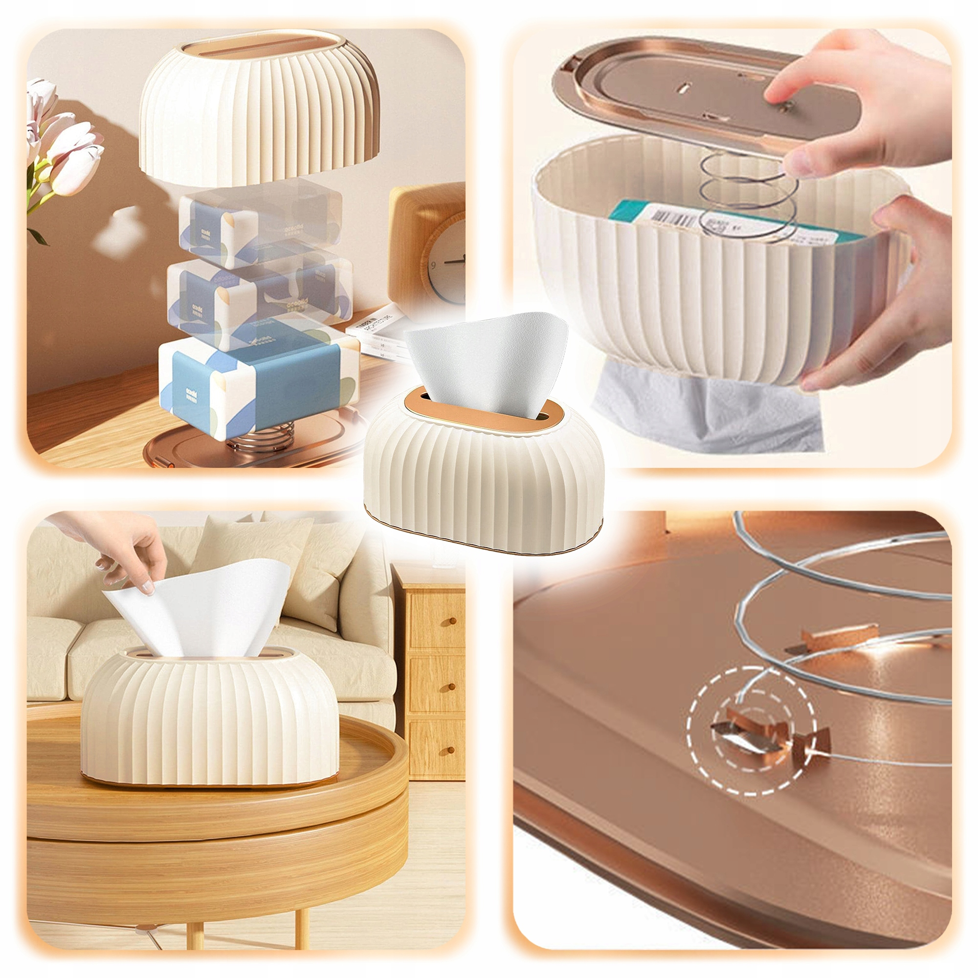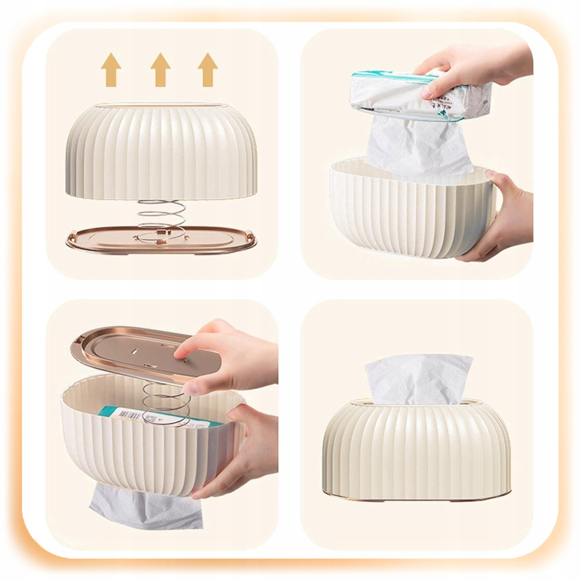 ♾️ Dzięki wbudowanej sprężynie i stabilnej konstrukcji, chusteczki automatycznie unoszą się do góry, co zapewnia łatwy dostęp i wygodę użytkowania.