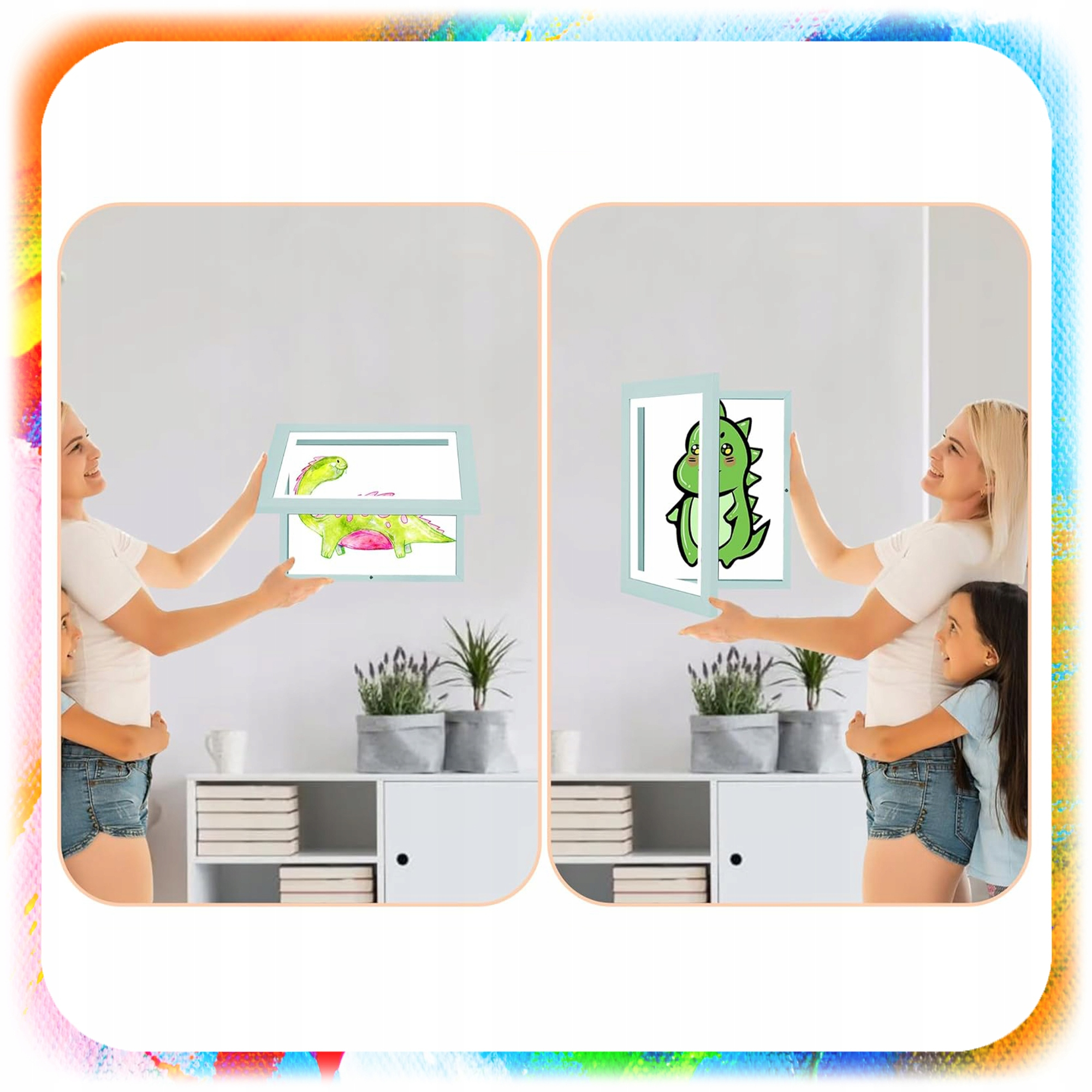 ☀️ Uniwersalna orientacja – możliwość zawieszenia w pionie lub poziomie, dopasowując ramkę do różnych formatów rysunków i zdjęć.