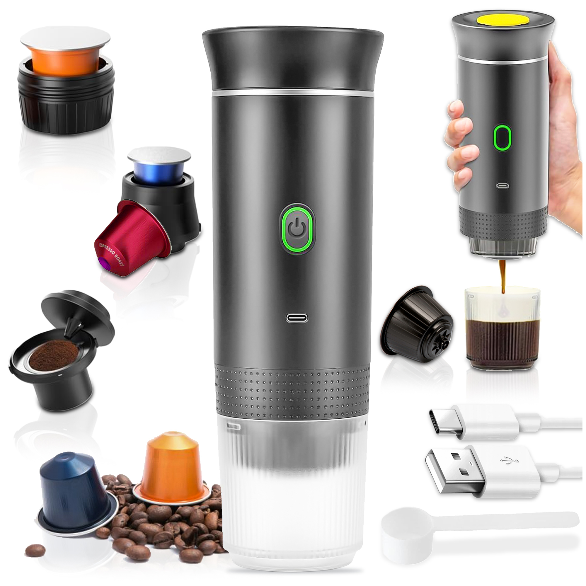 Nie musisz rezygnować z aromatycznej kawy w podróży, pracy, plenerze czy na campingu! Ten nowoczesny, kompaktowy ekspres 3w1 pozwala przygotować Twoją ulubioną kawę – gdziekolwiek jesteś. Gorąca lub zimna, z kapsułki czy kawy mielonej – Ty wybierasz.
